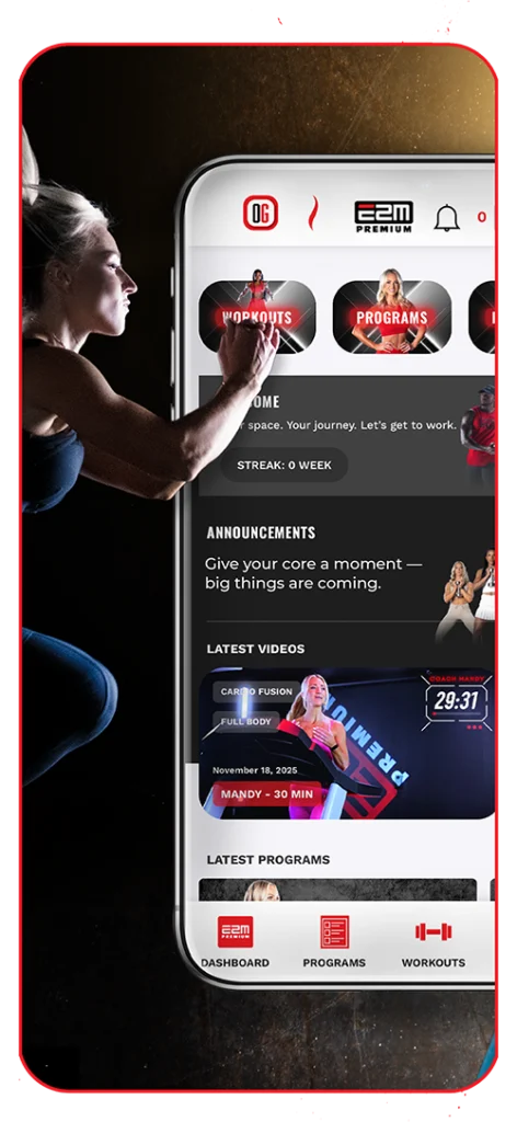 Whether you’re just getting started or looking for new ways to challenge yourself, E2M offers a variety of formats to keep movement engaging and accessible. Live workouts can be followed at home or in the gym, and on-demand replays provide the flexibility to stay active whenever it fits your schedule.